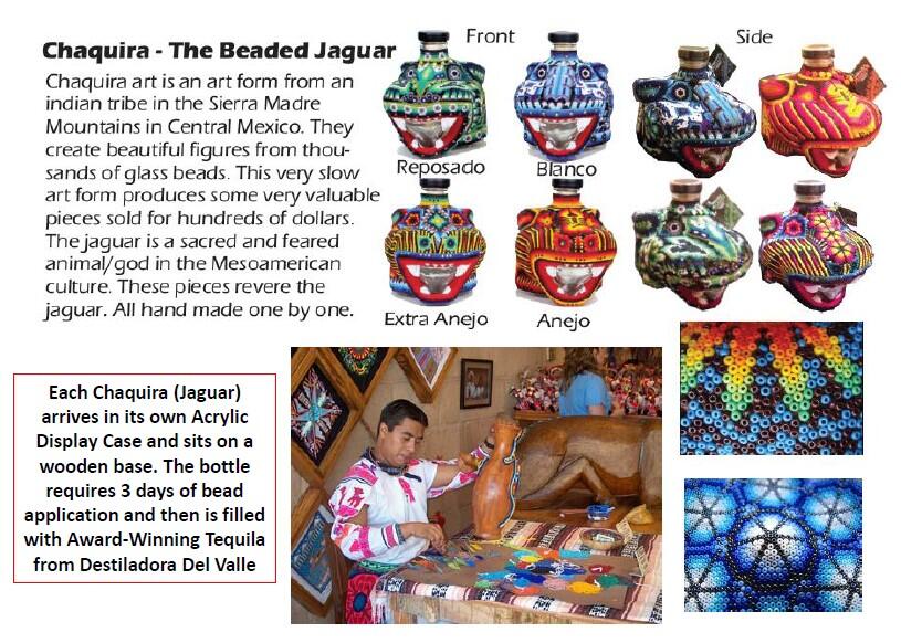 Chaquira Beaded Jaguar Reposado Email for all inquiries. Available in the App. Chaquira Beaded Jaguar Reposado A bottle of reposado Tequila packaged in a delightful jaguar-shaped bottle decorate with chaquira beads.
